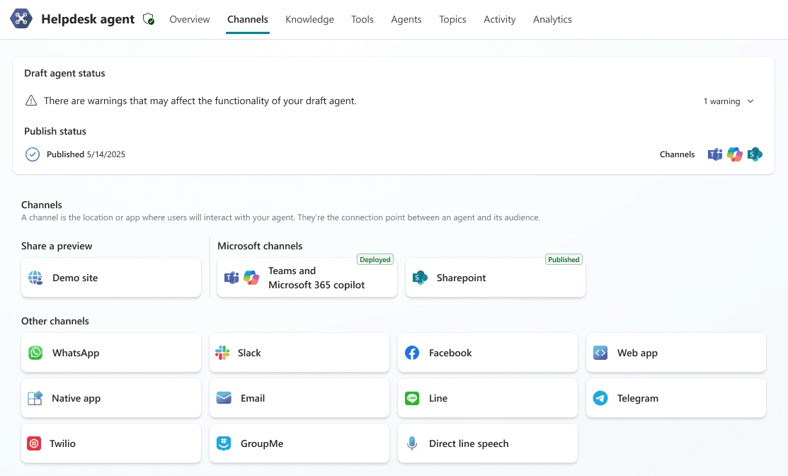 Summary: Copilot Studio is Microsoft’s platform for building and deploying custom AI copilots across enterprise workflows. As design owner for channels, publishing, and sharing, I lead UX efforts to integrate new communication platforms, streamline deployment workflows, and enhance collaboration features. My focus is on making complex AI capabilities intuitive and trustworthy for enterprise users—driving usability, adoption, and cross-team alignment.
