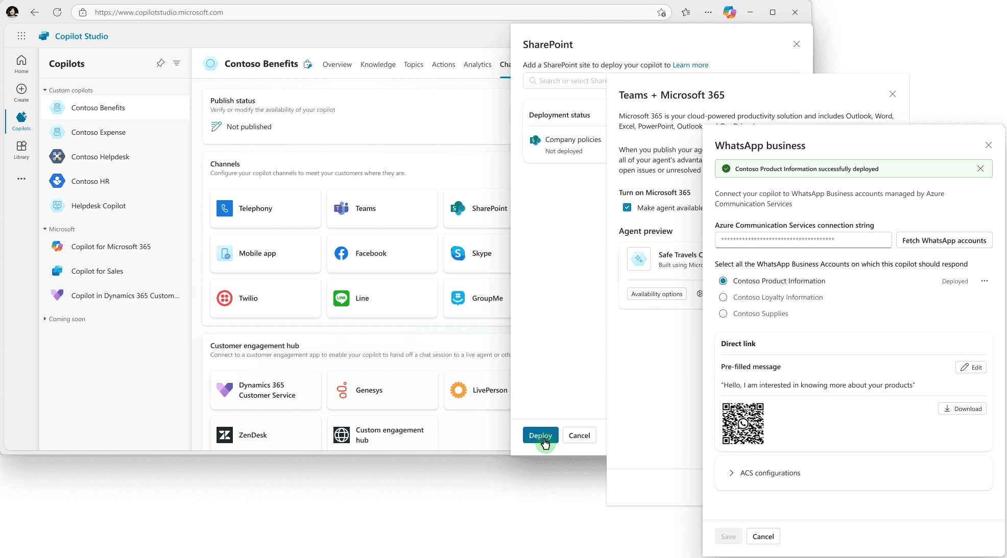 Led design for adding WhatsApp, SharePoint, and Slack as copilot channels.